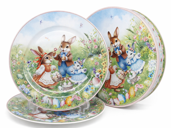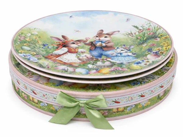 Zestaw dwóch talerzy zapakowany jest w piękne, sztywne pudełko w kształcie tuby, które idealnie chroni ceramikę i pełni funkcję dekoracyjną. Motyw na pudełku jest spójny ze zdobieniem na talerzach, co czyni ten komplet gotowym i niezwykle efektownym prezentem na "Zajączka", imieniny czy jako upominek dla gospodarzy wielkanocnego śniadania.