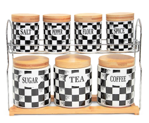 ZESTAW 7 POJEMNIKÓW CZARNO-BIAŁYCH Z DREWNIANYM TOPEM 33,5X25X12 CM