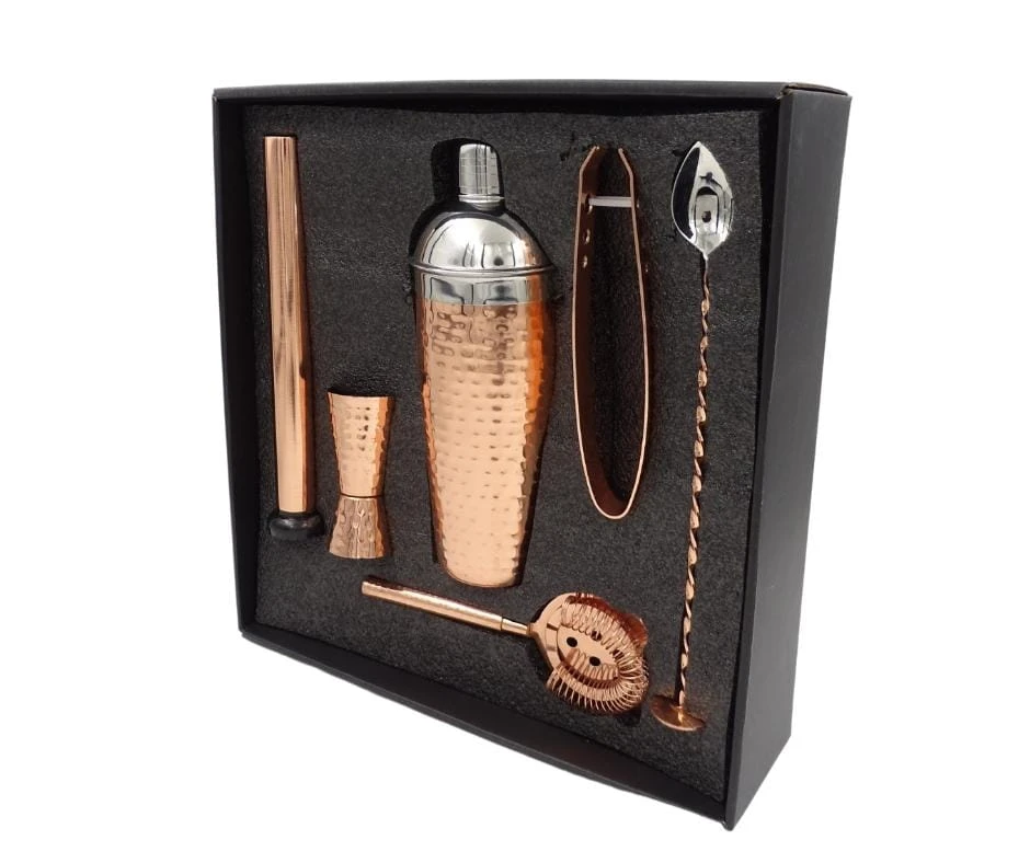 W skład zestawu barmańskiego wchodzą najważniejsze akcesoria, które pozwolą ćwiczyć alchemiczne zdolności domorosłego barmana: shaker, miarka, filtr, tłuczek, łyżka barmańska oraz szczypce do lodu. Zestaw wykonany jest ze stali nierdzewnej. Wszystkie elementy są w kolorze miedzianym, niekiedy ze stalowymi wstawkami. Zestaw barmański prezentuje się bardzo elegancko i przypadnie do gustu zarówno barmance, jak i barmanowi.
