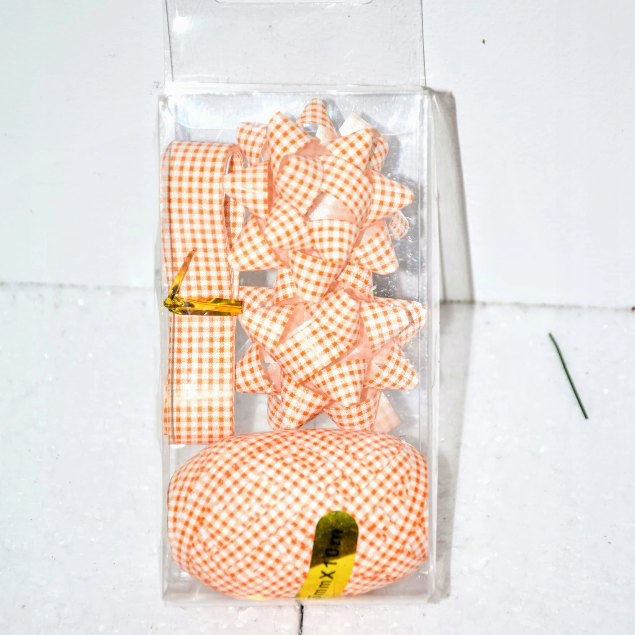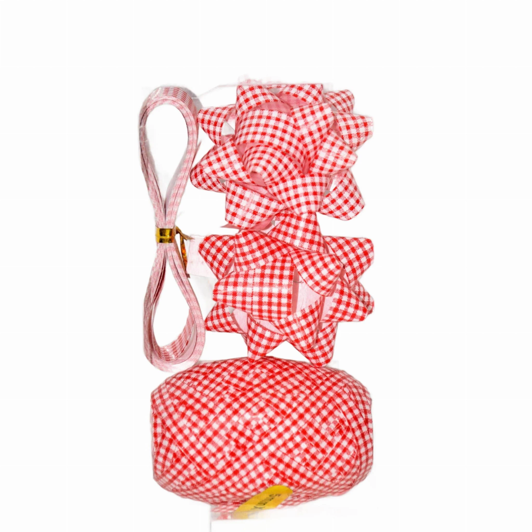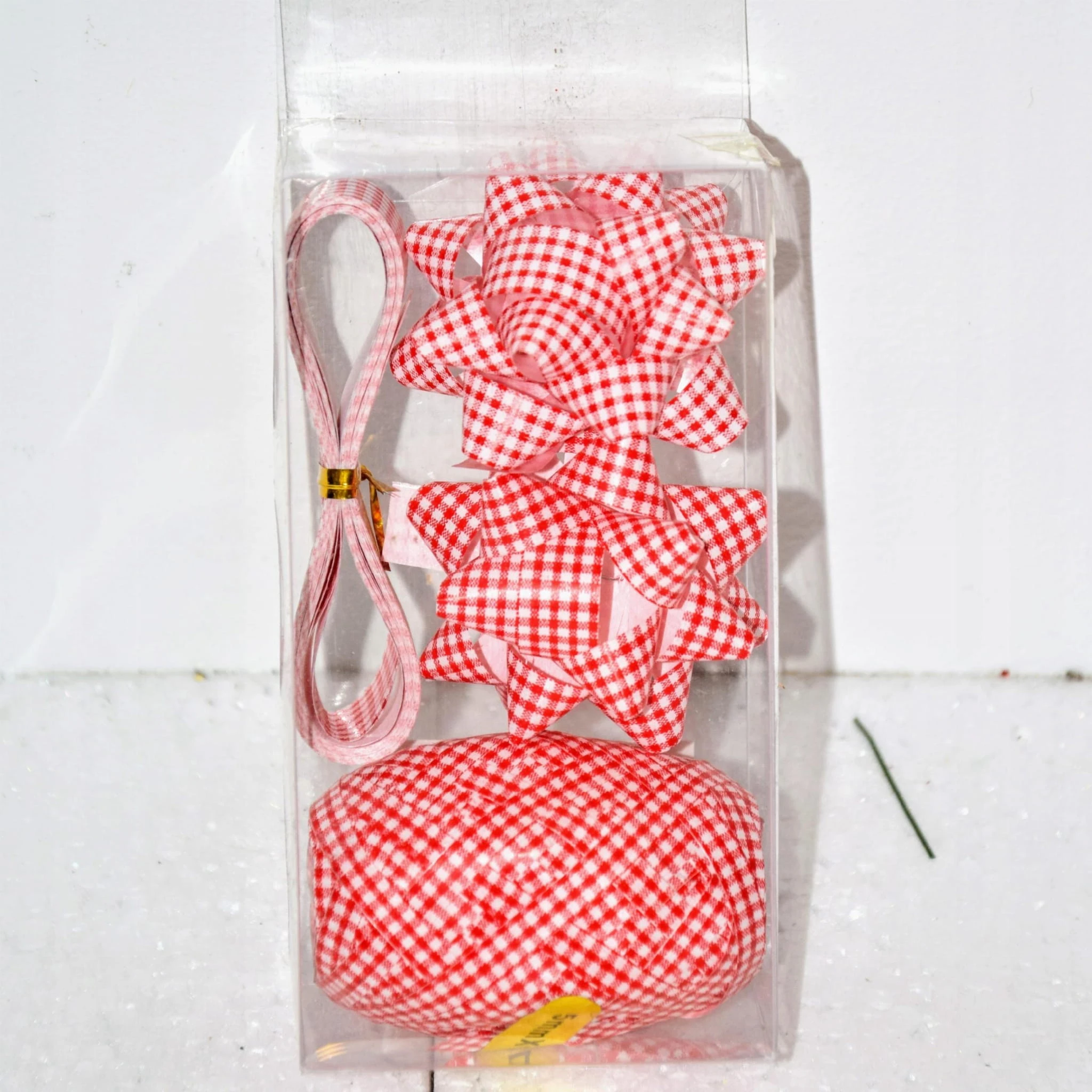 gotowy zestaw do pakowania prezentów zawierający dwie rozetki i wstążki w 2 szerokościach.