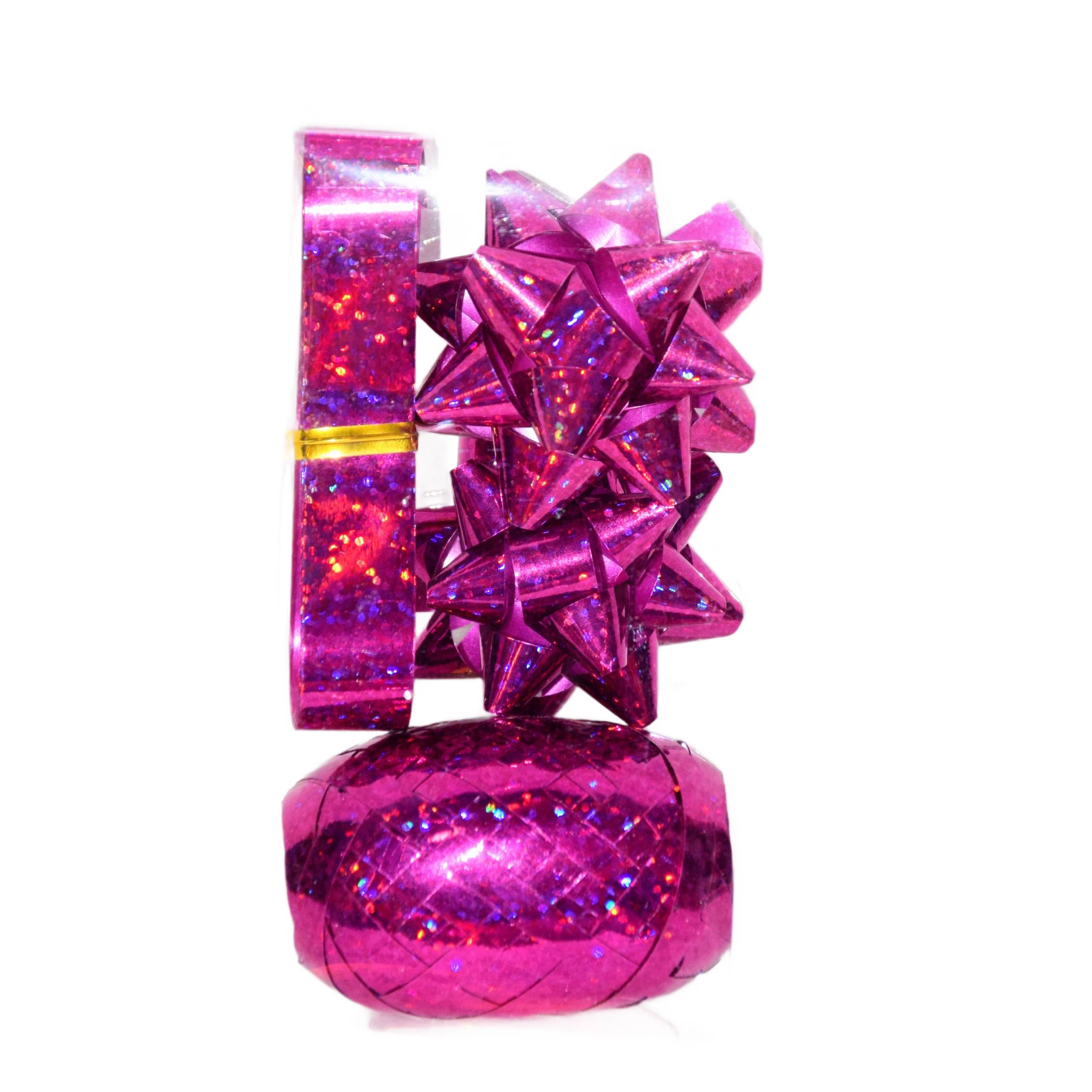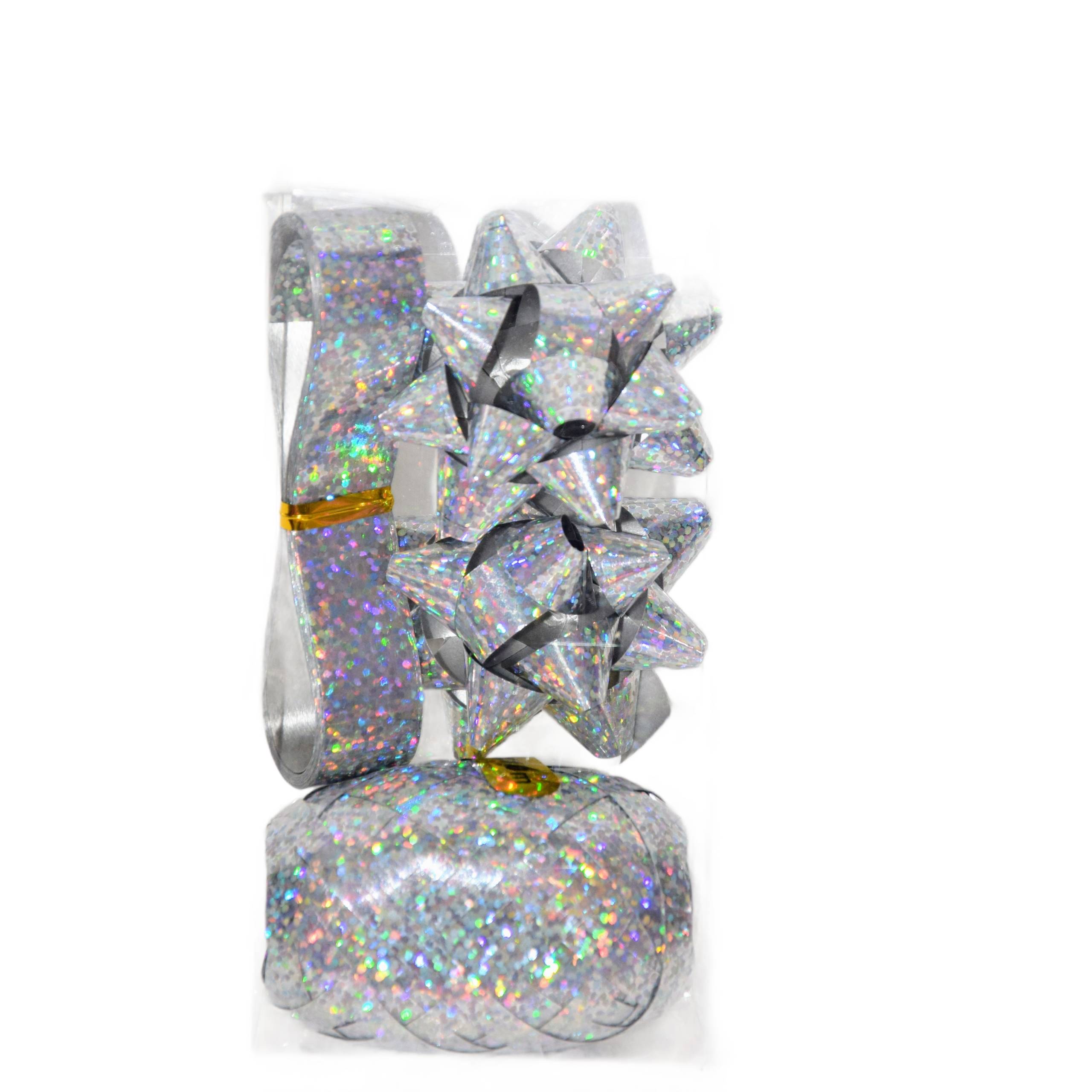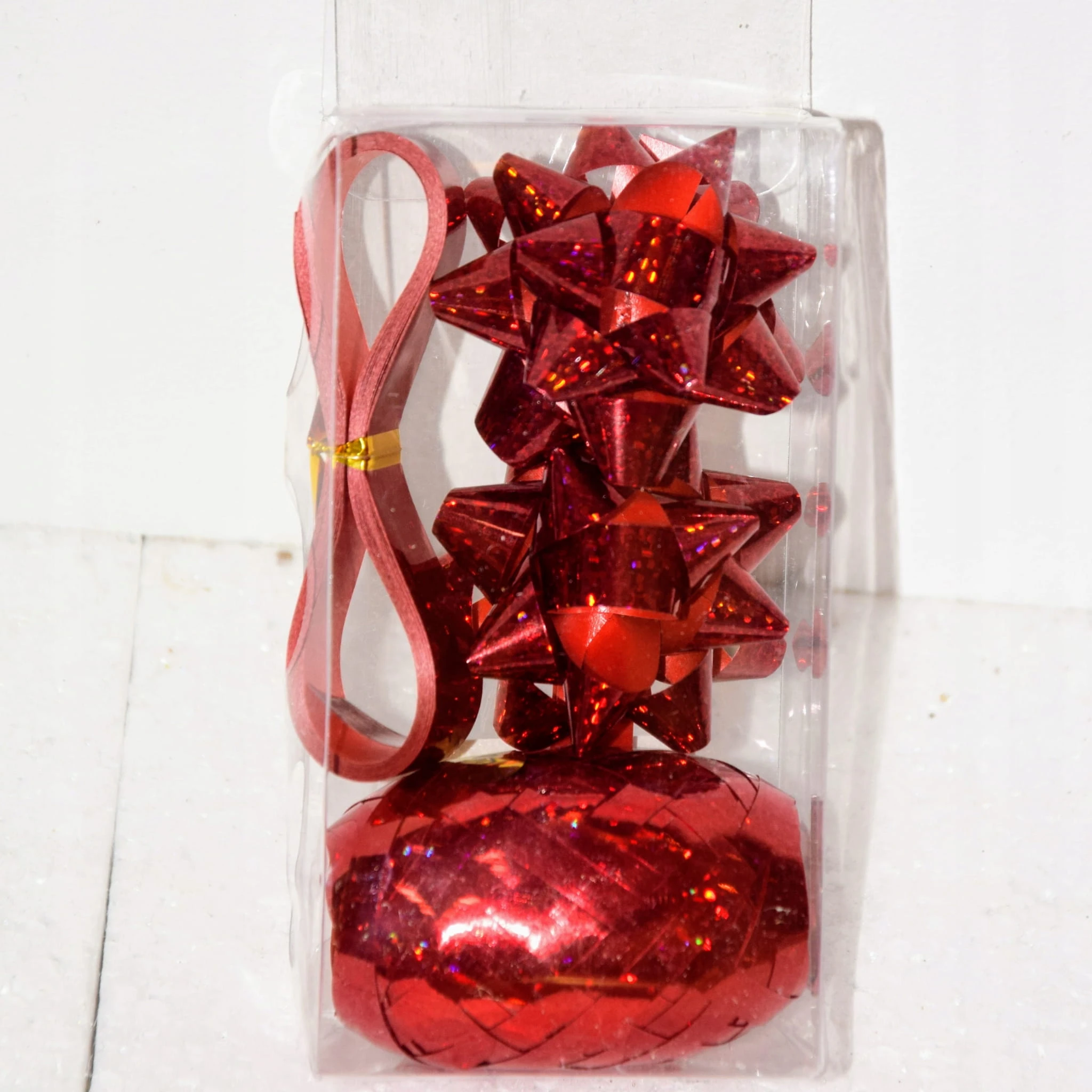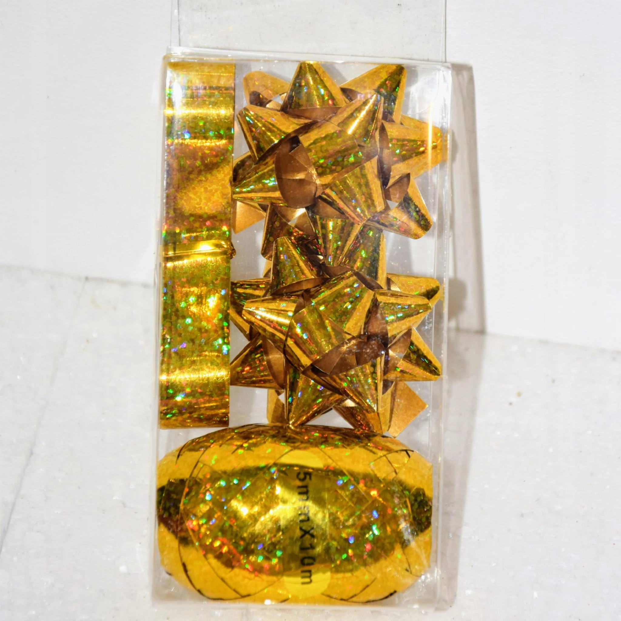 gotowy zestaw do pakowania prezentów zawierający dwie rozetki i wstążki w 2 szerokościach.