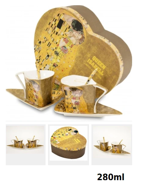Bardzo elegancki zestaw z motywem Pocałunku Gustawa Klimta składający się z dwóch filiżanek i dwóch talerzyków o ciekawym kształcie, oraz dwóch porcelanowych łyżeczek, zapakowanych w pudełko o kształcie serca. Doskonałe na prezent dla kobiety, na urodziny bądź imieniny.