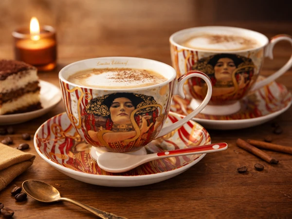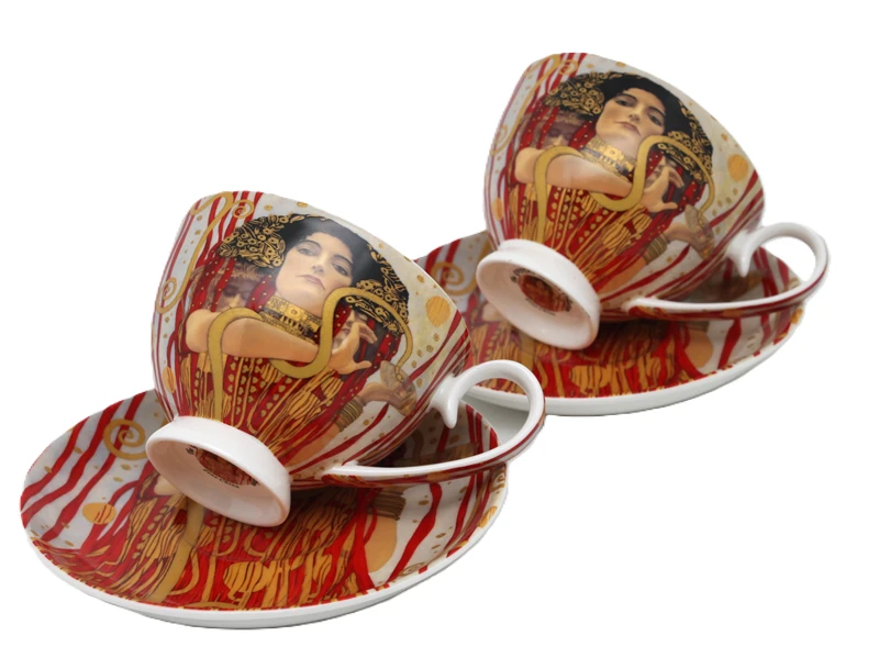Stylowe filiżanki ze spodkiem z motywem obrazu Medycyna Gustava Klimta. Produkt doskonale sprawdzi się do serwowania kawy, herbaty lub innych gorących napojów, a także jako efektowny element dekoracyjny.