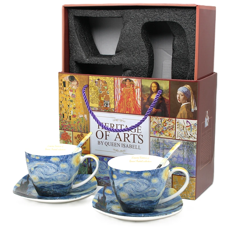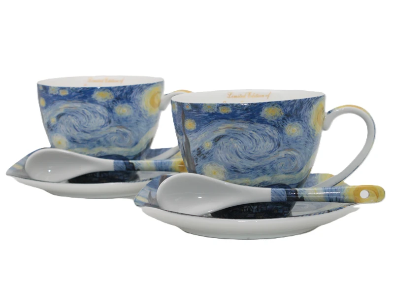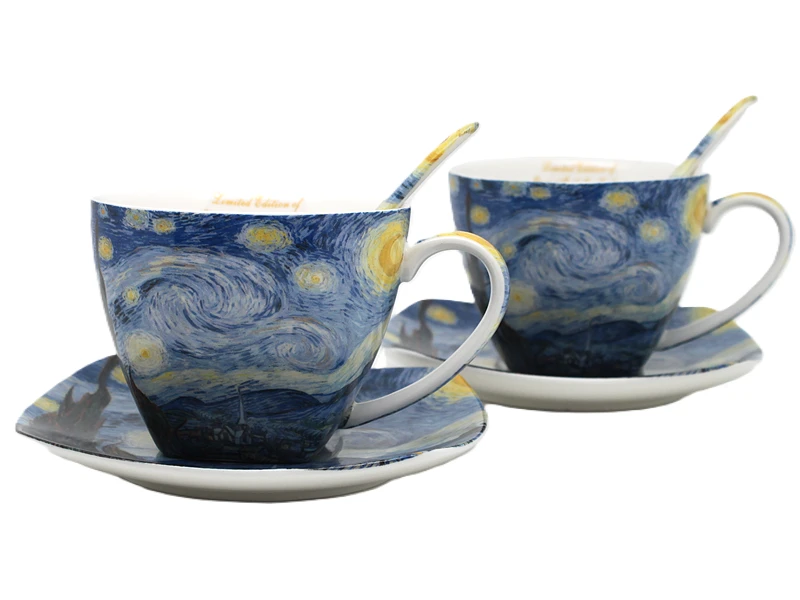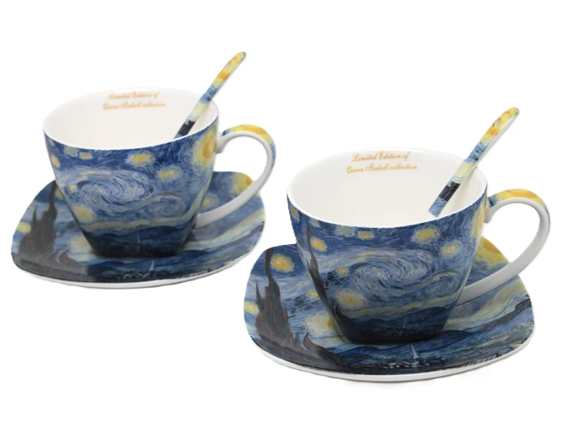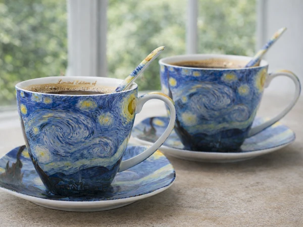 Stylowe filiżanki ze spodkiem z motywem twórczości Vincent'a van Gogh'a. Produkt doskonale sprawdzi się do serwowania kawy, herbaty lub innych gorących napojów, a także jako efektowny element dekoracyjny.