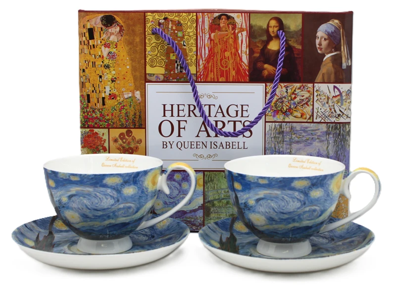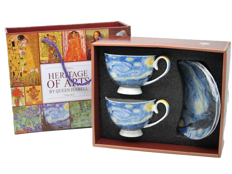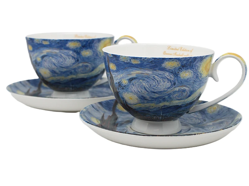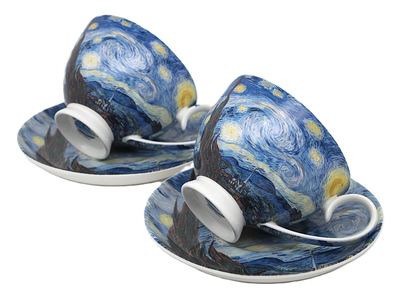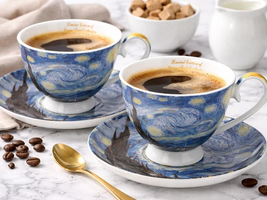 Stylowe filiżanki ze spodkiem z motywem twórczości Vincent'a van Gogh'a. Produkt doskonale sprawdzi się do serwowania kawy, herbaty lub innych gorących napojów, a także jako efektowny element dekoracyjny.