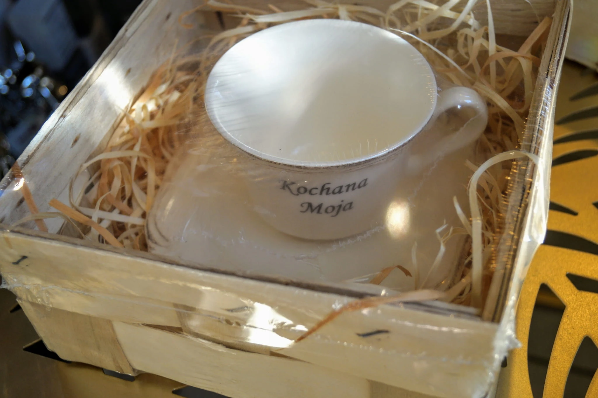 Filiżanka z napisem "Kochana moja", to idealny prezent dla partnerki, żony. Jest ona wykonana z polskiej porcelany, elegancko i bezpiecznie zapakowana w drewnianą skrzynkę z wiórkami sosnowymi.