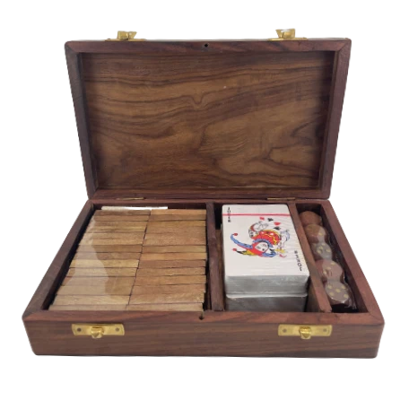 Pudełko: pudełko drewniane ze zdobienia mosiężnymi zamykane na zatrzaski. Przegródki do przechowywania każdej z gier. Wymiary pudełka: 23x14cm.