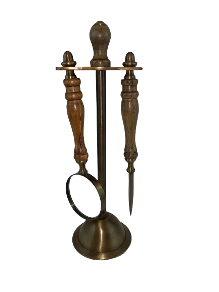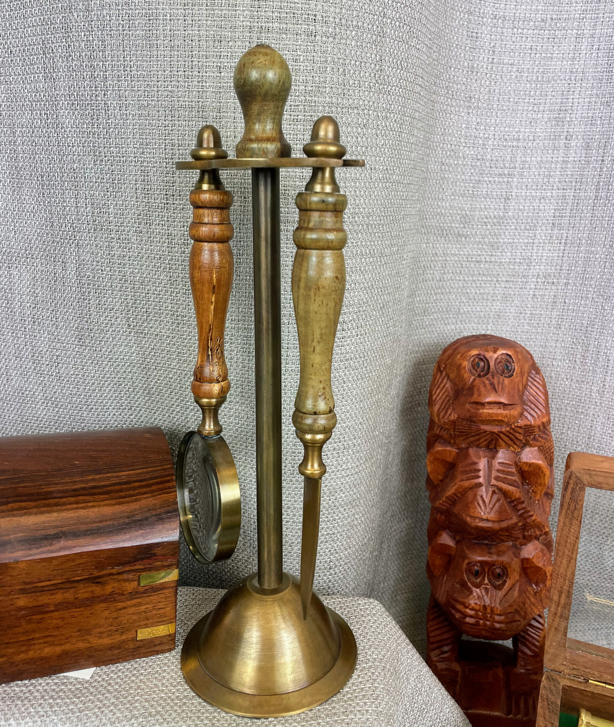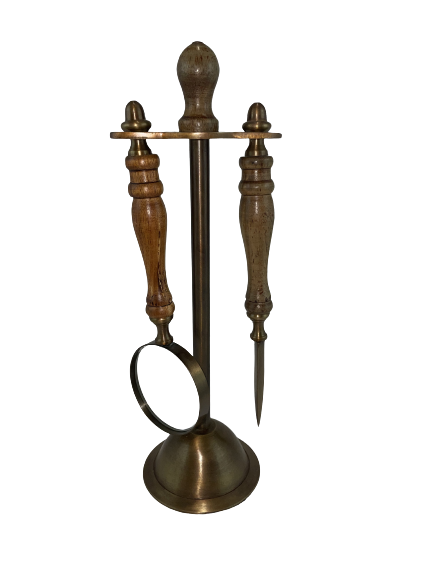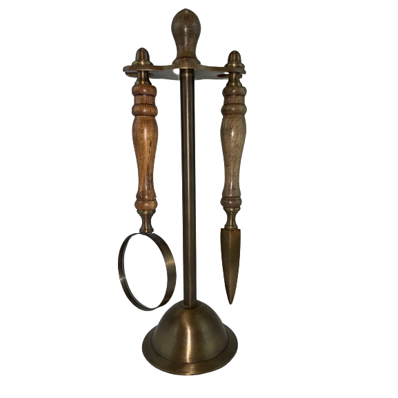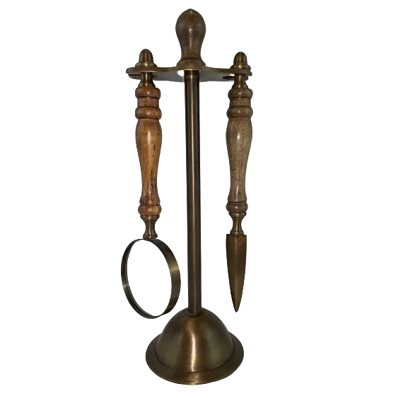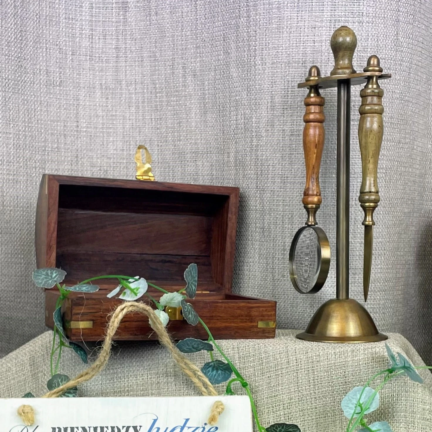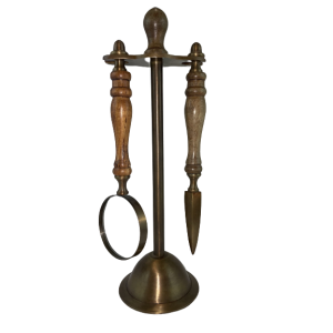 Piękny zestaw w postaci noża do papieru i szkła powiększającego zawieszonego na fantastycznym retro stojaku. Ekskluzywny pomysł na prezent, który spotka się z wielkim uznaniem. Doskonały pomysł na gadżet biznesowy zwłaszcza dla osoby mającej doczynienia z dużą ilością listów, takiej jak adwokat, radca prawny etc.