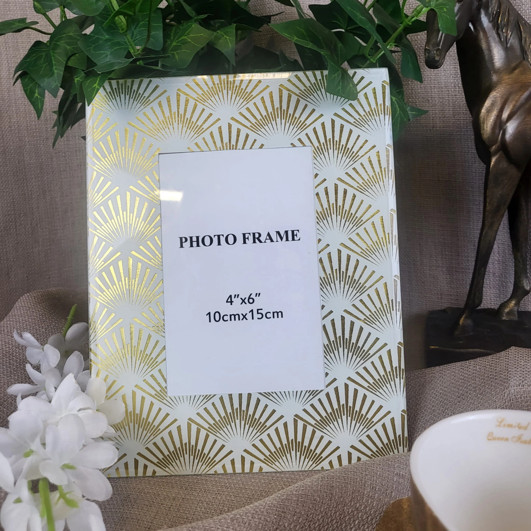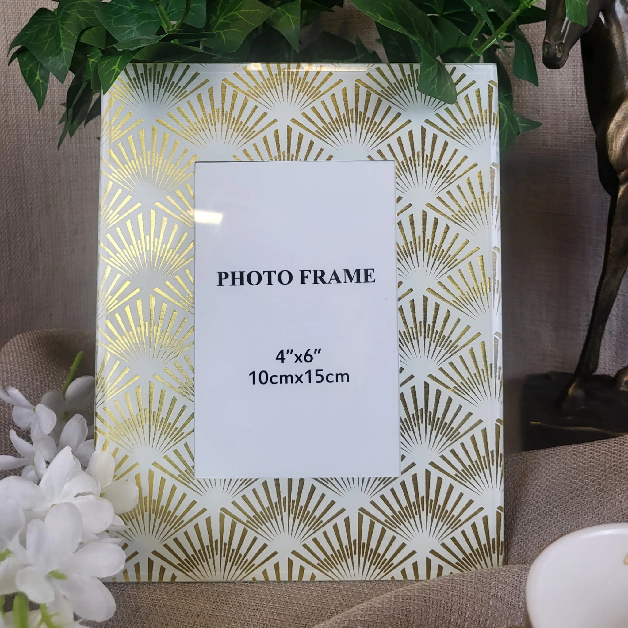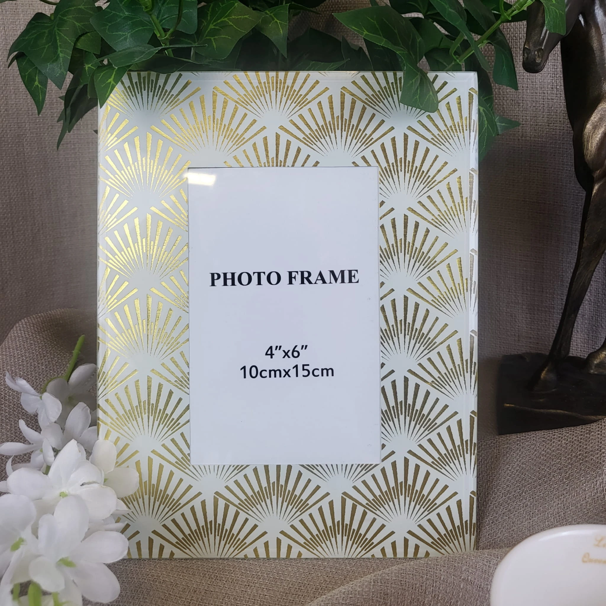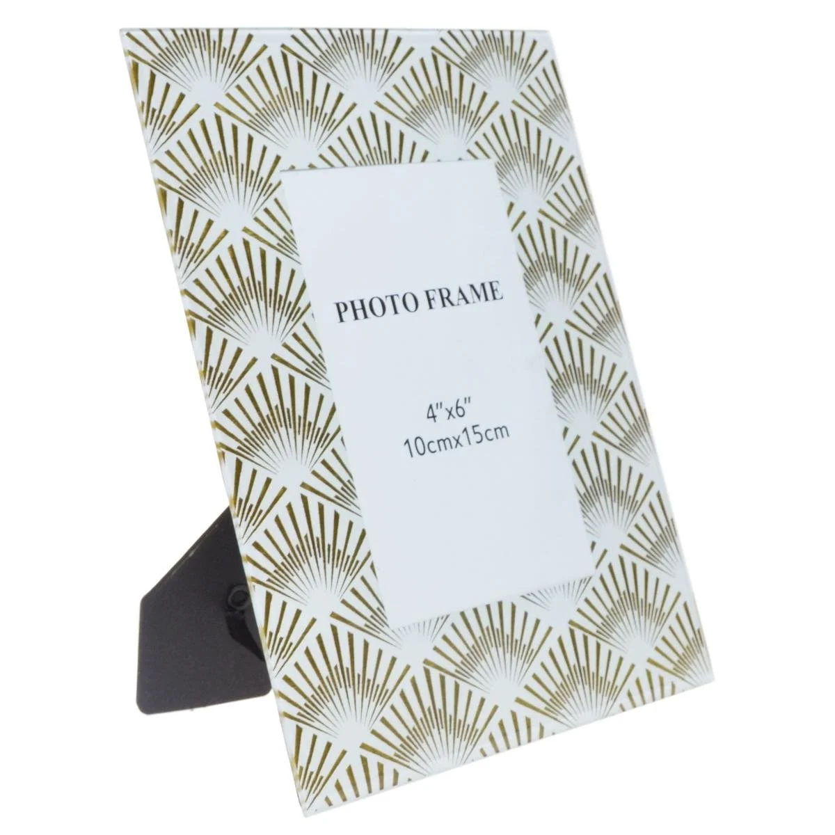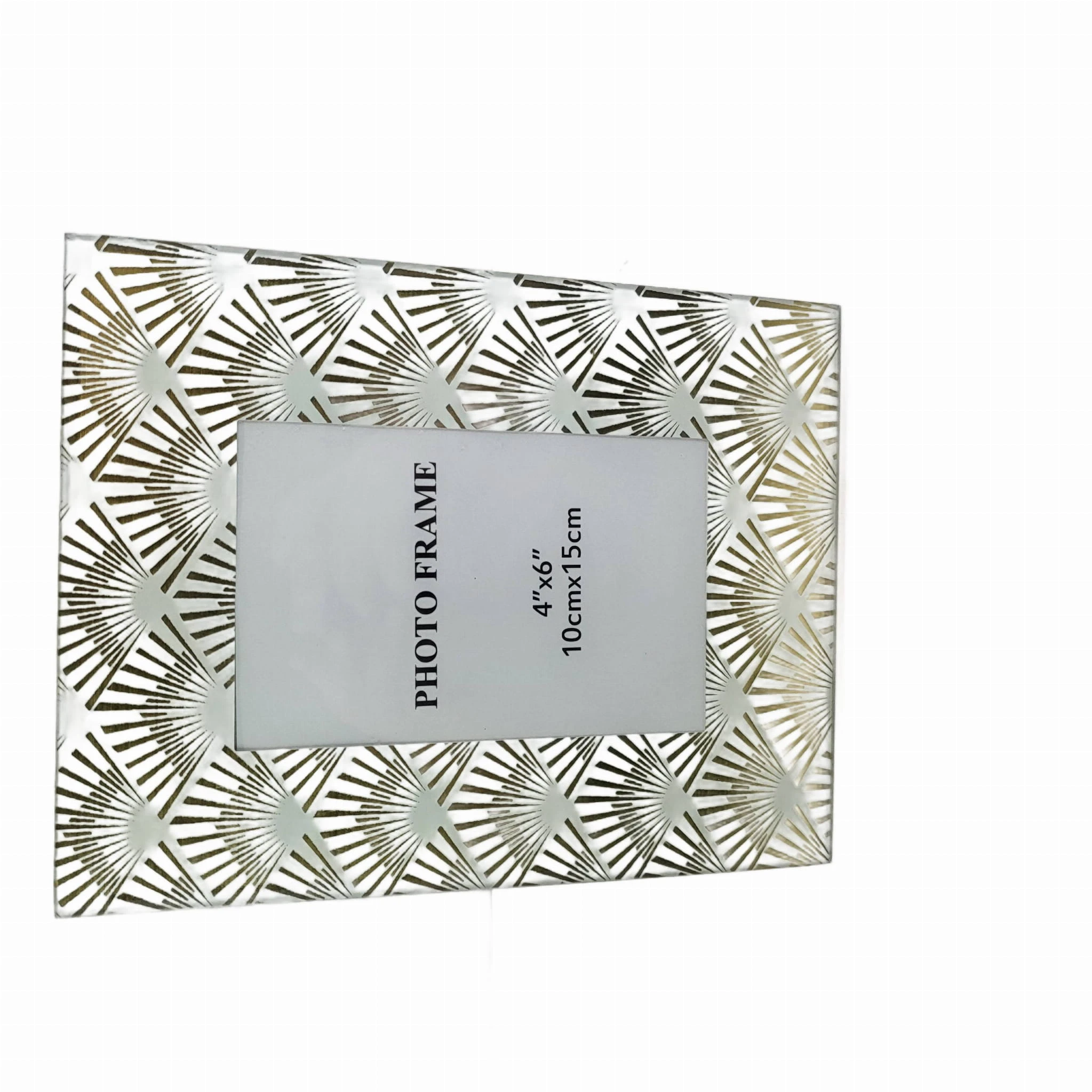 Złota ramka na zdjęcia wykonana w nowoczesnej stylistyce. Szklana ramka fotograficzna ozdobiona została geometrycznymi akcentami w modnym stylu glamour. Przepiękna oprawa do zdjęć z podpórką może być wspaniałym prezentem albo dodatkiem dekoracyjnym do postawienia na półce w salonie lub biurze.