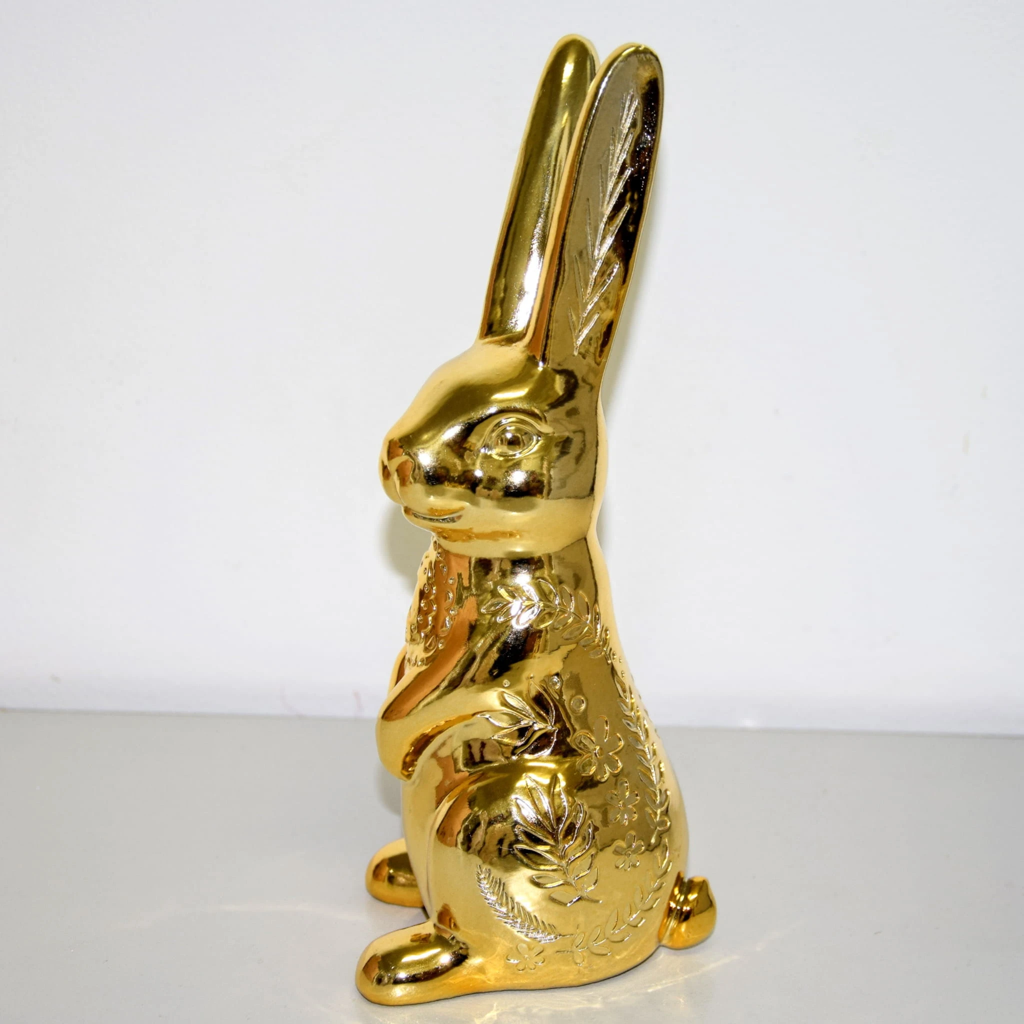 Figurka złoty królik stanowi nietuzinkową ozdobę do domu.