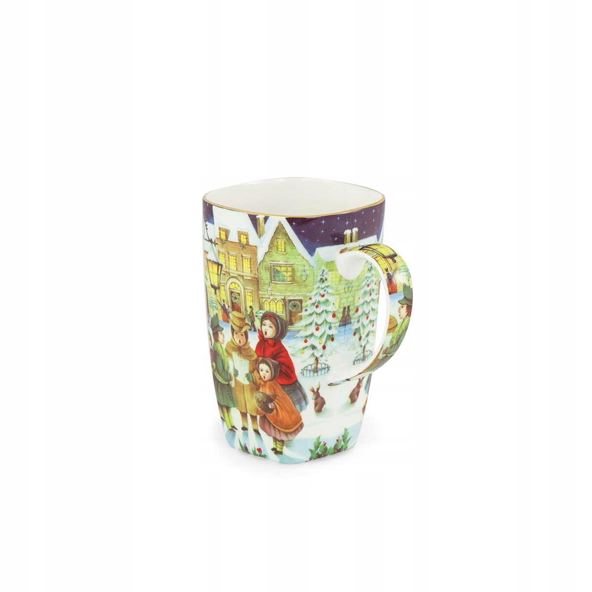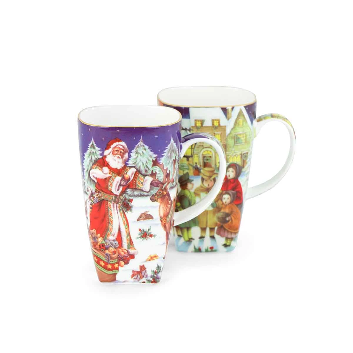 Zestaw dwóch dużych kubków, wykonanych z najwyższej jakości białej porcelany kostnej – Bone China. Lekko kwadratowy kształt w połączeniu z uroczymi, świątecznymi obrazkami w eleganckich kolorach tworzy intrygujące połączenie. Brzeg kubka dodatkowo ozdobiony cienkim, złotym paskiem.