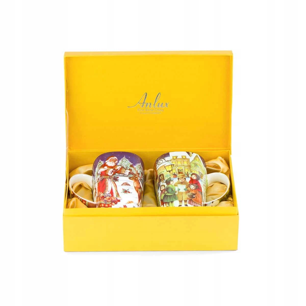 Zestaw kubków zapakowany jest w prezentowe, żółte pudełko, wyściełane atłasową tkaniną i sygnowane logiem firmy Anlux.