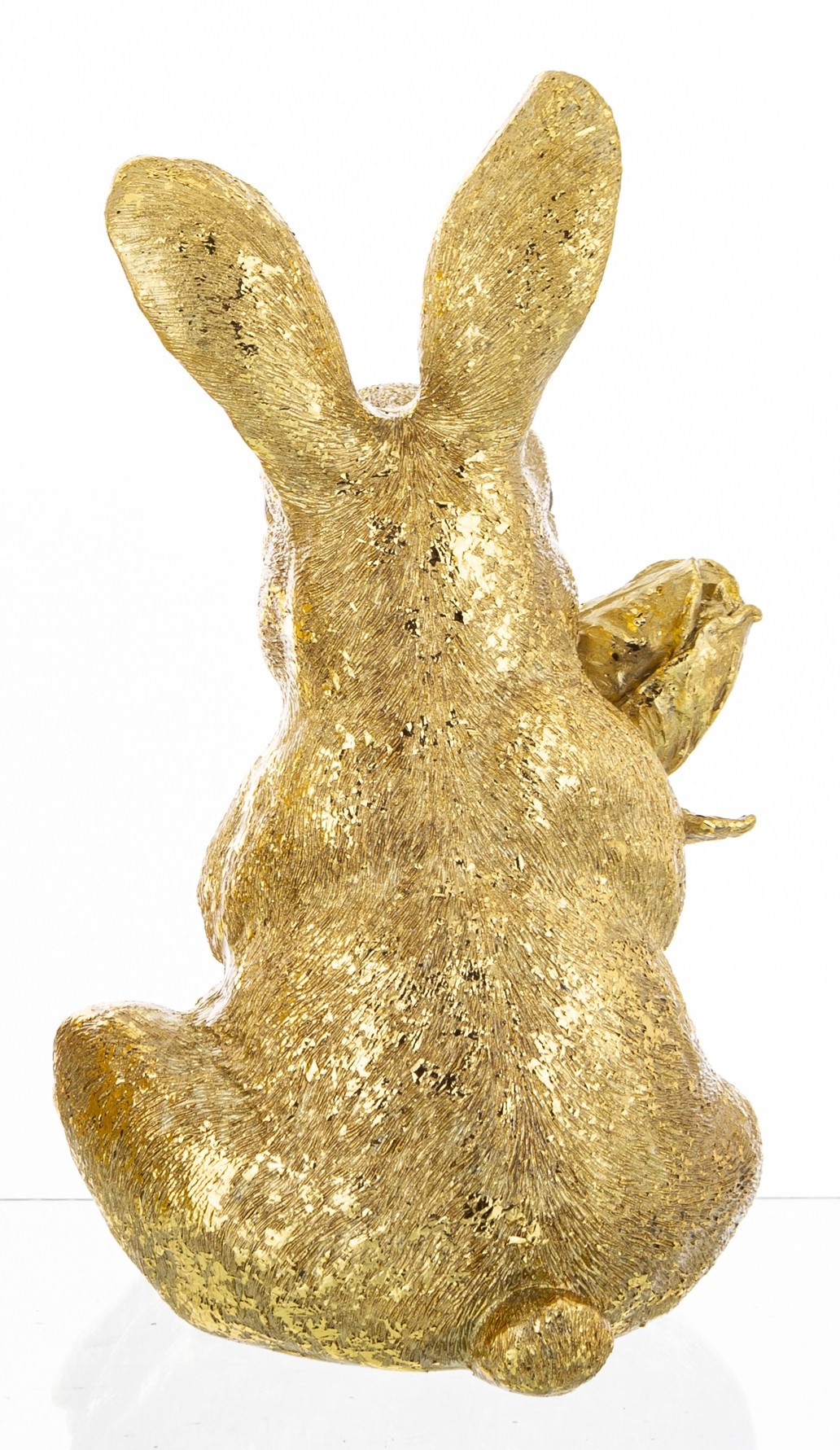 Dodaj swojej przestrzeni szczyptę luksusu i radosnej, wiosennej energii. Ta wyjątkowa figurka siedzącego zająca w kolorze antycznego złota to dekoracja, która przyciąga wzrok i wywołuje uśmiech. Zajączek trzymający w łapkach pąk kwiatu to symbol budzącej się do życia przyrody, podany w niezwykle eleganckiej, metalicznej formie.